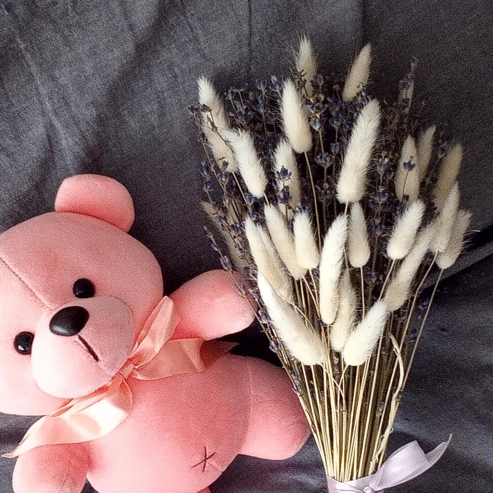 мишка плюшевый 23 – 1 шт.Лаванда (сухоцвет) – 85 шт.Лагурус (сухоцвет) – 11 шт.Лента – 1 шт.