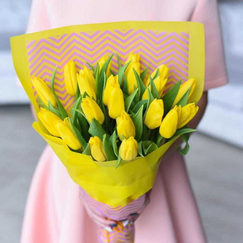 Букет из 21 жёлтого тюльпана в дизайнерской упаковке