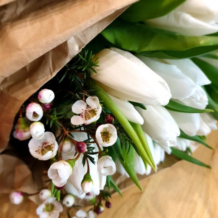 Лента атласная – 1 шт.Открыточка с вашими пожеланиями – 1 шт.Ваксфлауэр белый – 2 шт.тюльпаны белые – 15 шт.любовь флориста (бесплатно) – 1 шт.крафт жатая бумага – 1 шт.